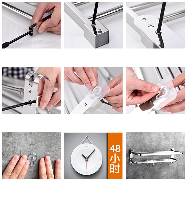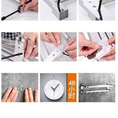 Bộ sản phẩm gồm: kệ inox, miếng dán tường và bộ vít nở