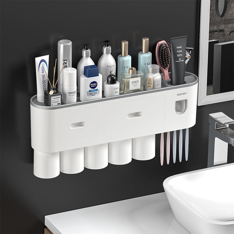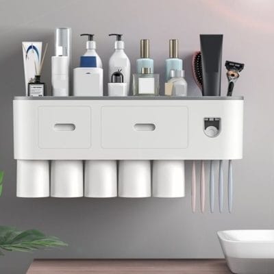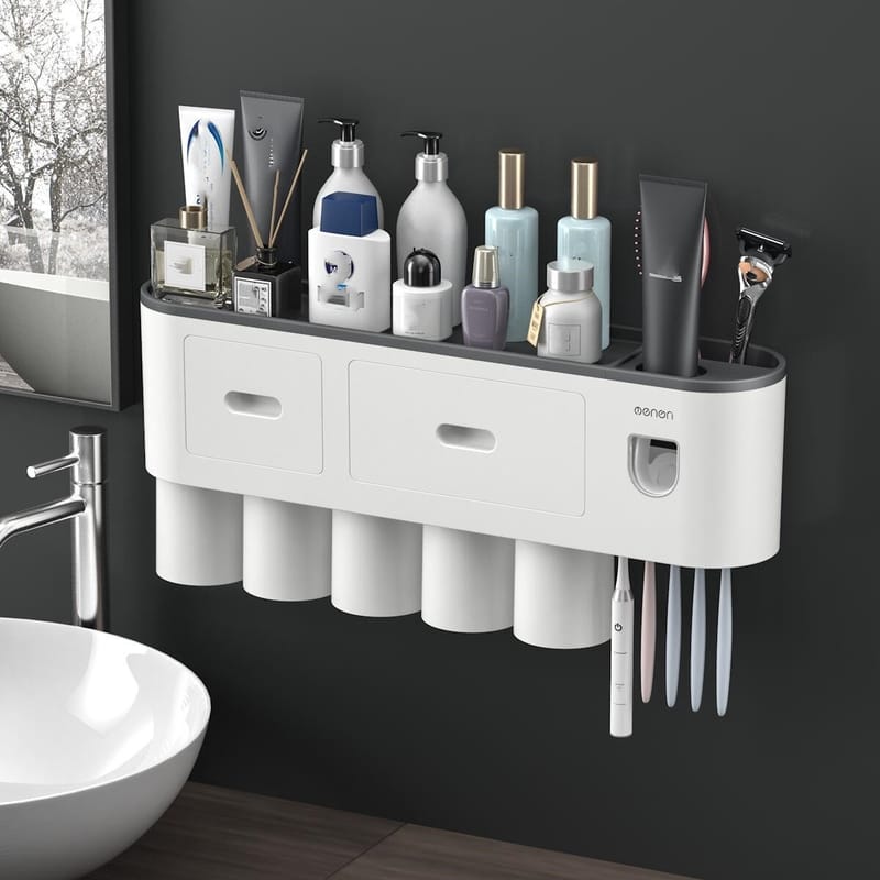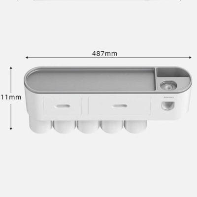 Kệ nhả kem đánh răng tự động OENONVN phiên bản 5 cốc được thiết kế để treo tường, giúp sắp xếp gọn gàng các vật dụng phòng tắm và tiết kiệm không gian sử dụng hằng ngày.